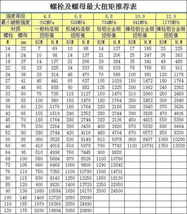 扭矩是驅(qū)使物體發(fā)生轉(zhuǎn)動(dòng)的一種特殊力矩,在功率固定的條件下它和轉(zhuǎn)速呈反比關(guān)系,轉(zhuǎn)速越快扭矩就越小,反之則越大。BOLTING機(jī)械為了讓廣大用戶更好的使用液壓扳手,下面這張螺栓螺母扭矩值推薦表,有需要的朋友一定要收藏哦,這張對(duì)照表格能夠讓用戶在使用液壓扳手時(shí)更快速的知道適合哪種型號(hào)的液壓扳手。