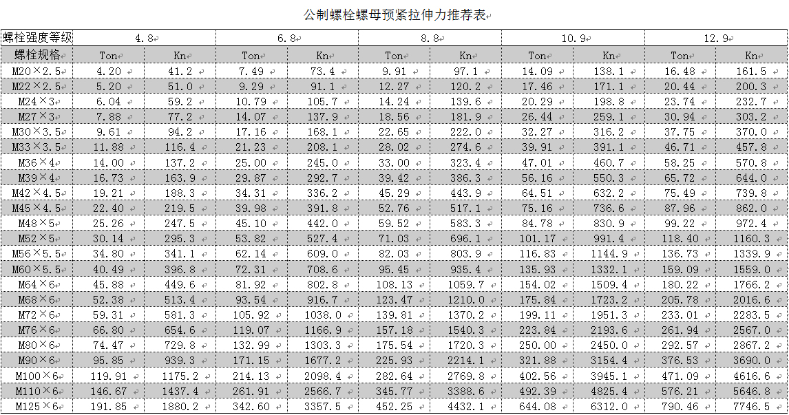 公制螺栓螺母預緊拉伸力推薦表